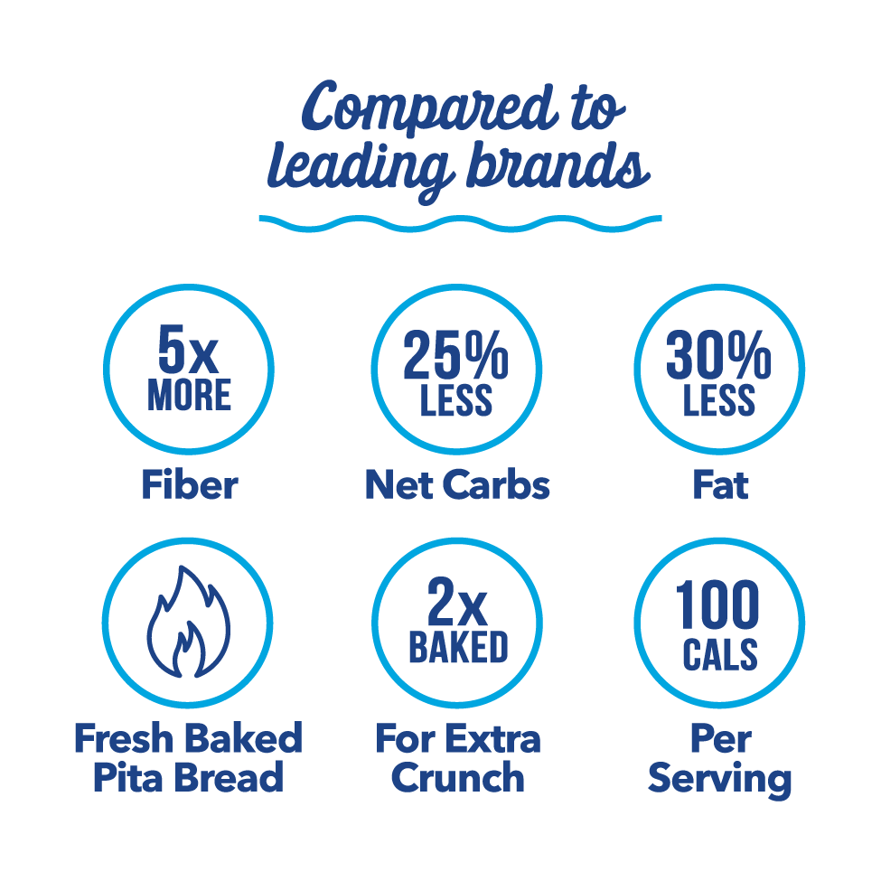 Perfect Pita Chips are 6g high fiber, lower carb, and twice baked from fresh pita bread for extra crunch!
